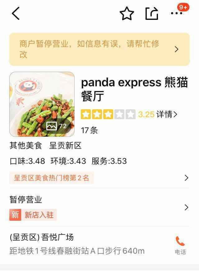 10月21日,澎湃新闻记者获悉,目前位于云南昆明呈贡区吾悦广场的“panda express熊猫餐厅”已经暂停营业,大门紧闭。并且,其在大众点评上的页面也显示“商户暂停营业”...